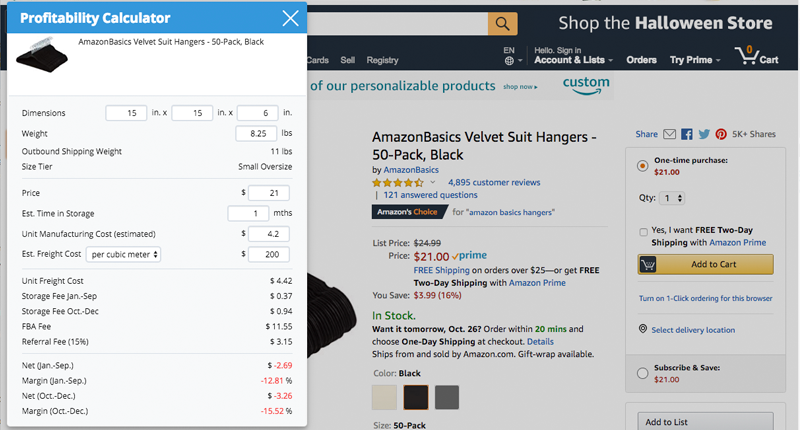 • Profitability Calculator – Enter in a product’s dimensions, weight, price, time in storage, manufacturing, and shipping costs to estimate the profitability of the item.