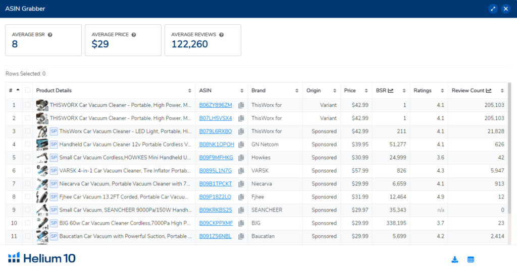 可以看到当前结果页面所有产品的总销售额、平均销售额、平均售价、平均评论数,以及Helium 10对于这个市场给出的机会分数