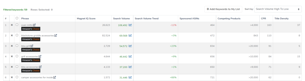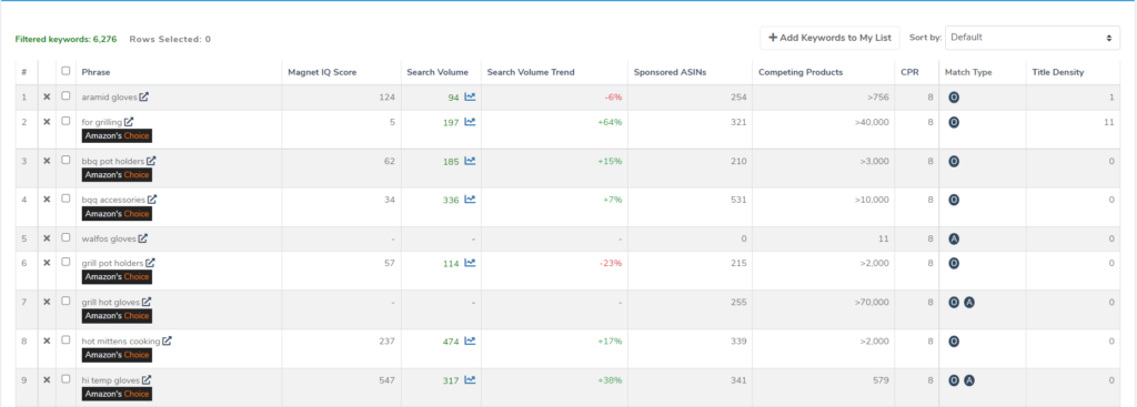 Phrase:关键词列表(带有Amazon Choice黑标的说明该关键词下方有获得Amazon Choice标志的商品)