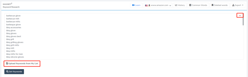 首先,点击下拉窗口使输入框变长,接着输入需要查询的关键词(最多200个);或者直接点击“Upload Keywords from My List”加载关键词;然后点击“Get Keywords”获取查询结果