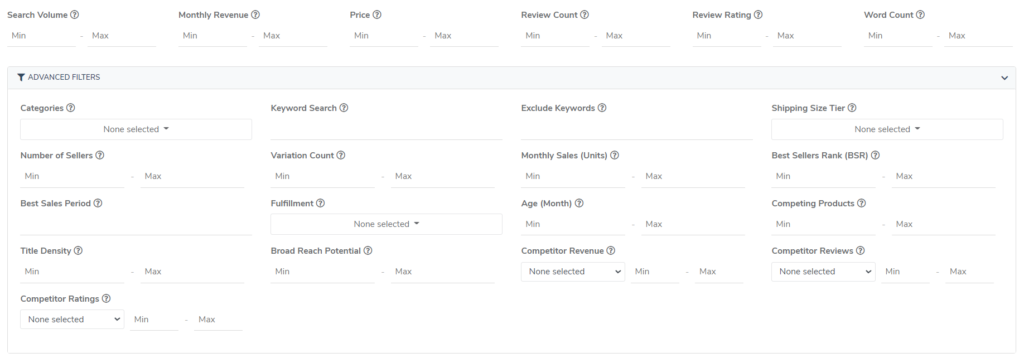 如果您想通过Helium 10大数据来选品,可以使用这个工具,此工具一共分为两个模块:参数设置模块和搜索结果模块