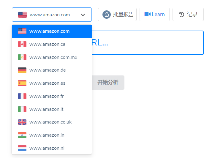 首先,在箭头下拉栏处可以选择用于Listing分析工具所在的市场:目前支持10个亚马逊站点