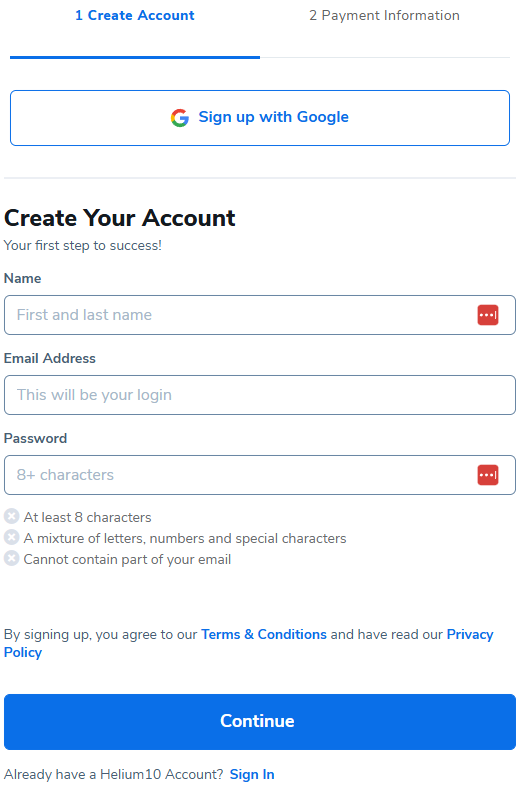 6. 选择立即购买后,将打开一个表单以创建您的账户和最终的Helium 10登录凭据。通过输入您的全名、电子邮件地址和密码来创建账户。点击继续付款并输入您的信用卡详细信息。