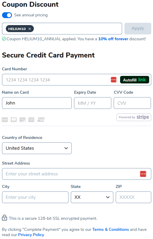 7. 付款信息屏幕将显示您已应用的优惠券以进行确认。输入您的付款信息,然后点击完成付款。恭喜!您现在可以开始使用您的Helium 10账户了。