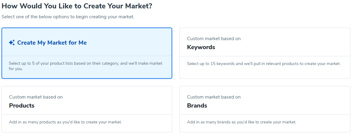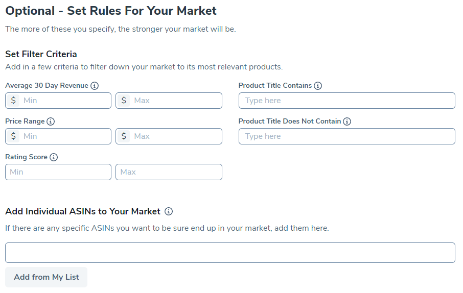 在创建市场之前,您可以选择设置一些规则。我们建议查看并选择适用于您市场的任何规则,因为您用来筛选产品的规则越多,您的市场就越强大。您还可以添加特定的ASIN以确保它们包含在您的市场中。