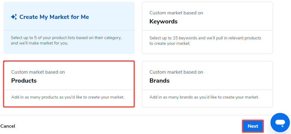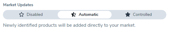 如果您的市场包含关键词,您可以选择将市场更新应用于您的市场。您可以选择自动以将新识别的产品添加到您的市场,或选择受控以将新产品添加到您市场设置中的建议产品选项卡下。选择禁用将确保您的市场不会更新额外产品。