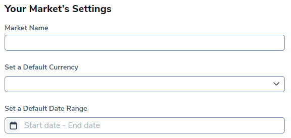您快完成了!在这最后一步,您将为您的市场设置一些基本设置,例如市场名称、默认货币和日期范围。
