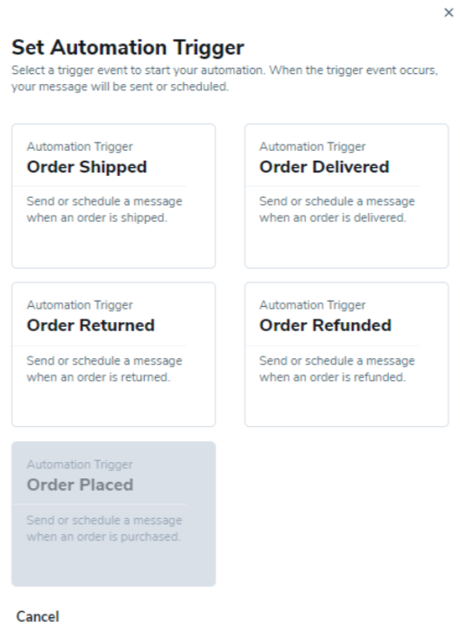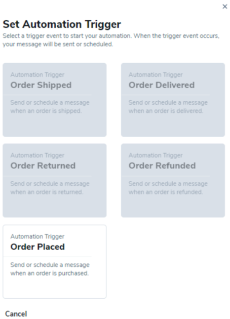 如果选择了任何其他预制模板,可以选择其他触发器(订单已发货、订单已送达、订单已退款、订单已退货)。