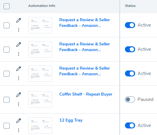 完成选项设置后,在右上角选择保存并退出。现在,您的新自动化流程将显示在您的自动化列表中。您可以通过此列表中的状态切换来启用和禁用您的自动化流程。