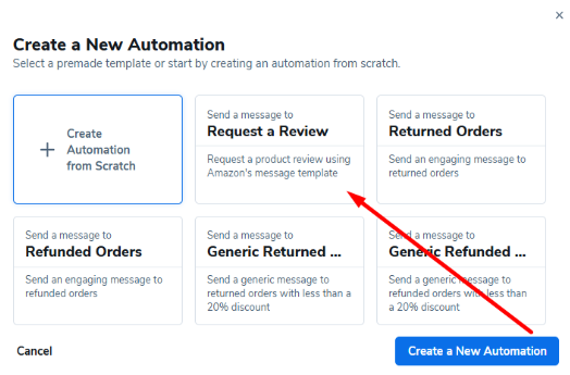 3. 在自动化选择窗口中,您将看到创建自己的自动化以及跟进预置自动化的选项。如果您只想针对特定SKU或一组SKU,您需要从头创建自动化。但如果您只是简单地自动化所有SKU的销售以触发请求评论的电子邮件,请选择使用‘亚马逊默认’模板的请求评论选项。
