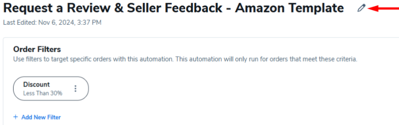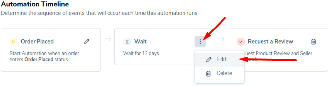 4. 在 编辑自动化 窗口中,您可以修改自动化的条件。跟进模板预设电子邮件等待时间为亚马逊下单后12天。如果您的产品需要更长时间供人们使用并确定其体验是正面还是负面,您可以将时间线编辑为更长。Helium 10建议给予客户足够时间接收和使用您的产品。