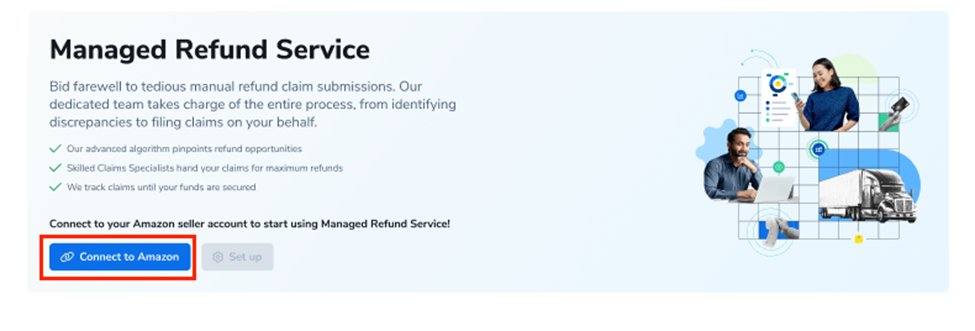 首次访问托管退款服务时,系统将提示您选择“连接到亚马逊”以开始设置您的账户。通过连接到亚马逊,您即允许该服务工具连接到您的亚马逊卖家中心令牌,以查找可为其提供MRS服务的账户。