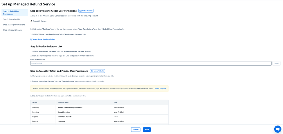 选择设置后,您将被引导至一个新的着陆页面,通过完成以下4个步骤继续设置您的亚马逊账户与MRS的连接: