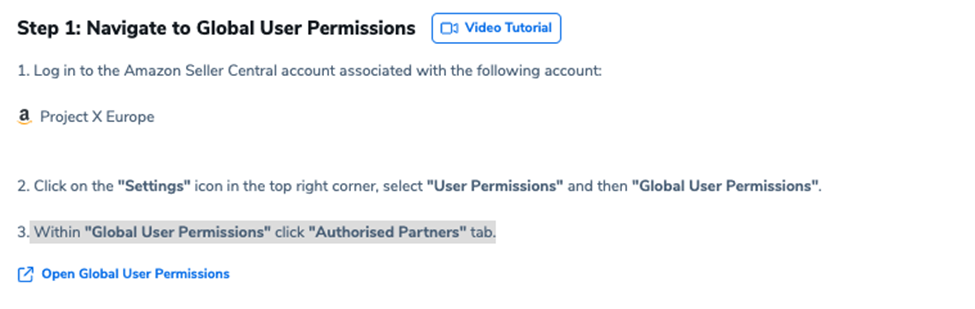 1. 登录相应的亚马逊卖家中心账户。选择链接打开全局用户权限以快速访问并登录亚马逊卖家平台。