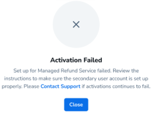 如果激活失败,您将收到一个显示“激活失败”的模块,并提示您检查所提供的信息,并在必要时重新执行步骤。如果激活持续失败,您可以联系支持人员。