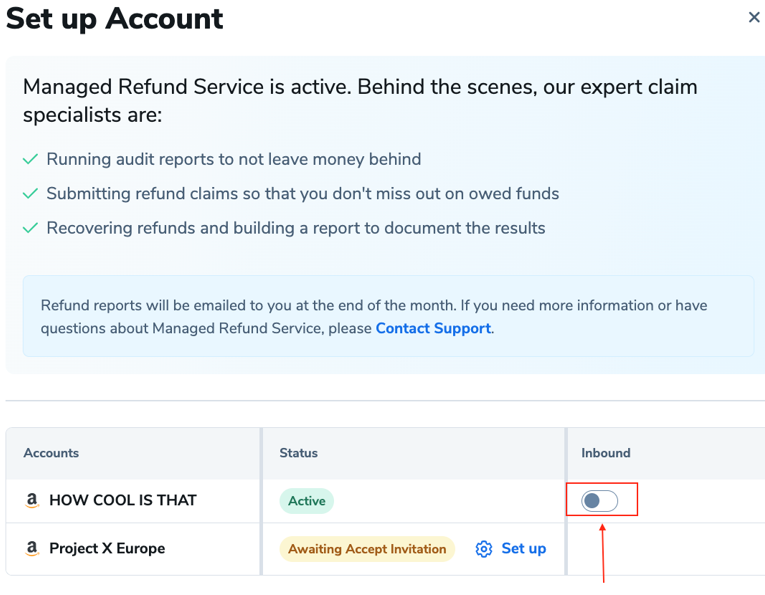 要为已激活的账户启用入库索赔,请在账户下拉菜单右侧选择“设置账户”。这将在屏幕右侧的页面中显示您的账户列表。