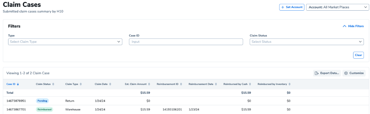 - 账户: 显示与索赔关联的账户。要显示此列,请在表格设置中启用它。