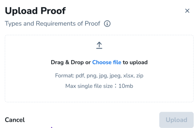 - 在弹出窗口中,您可以点击选择文件从您的设备浏览并上传必要文件,或者直接将文件拖放到指定区域。