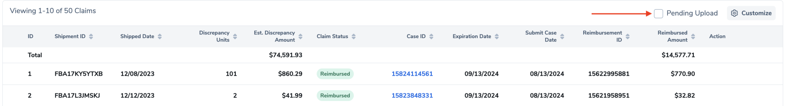 - 在入库索赔页面上,选择待上传选项以筛选并仅显示需要额外文件的案件。