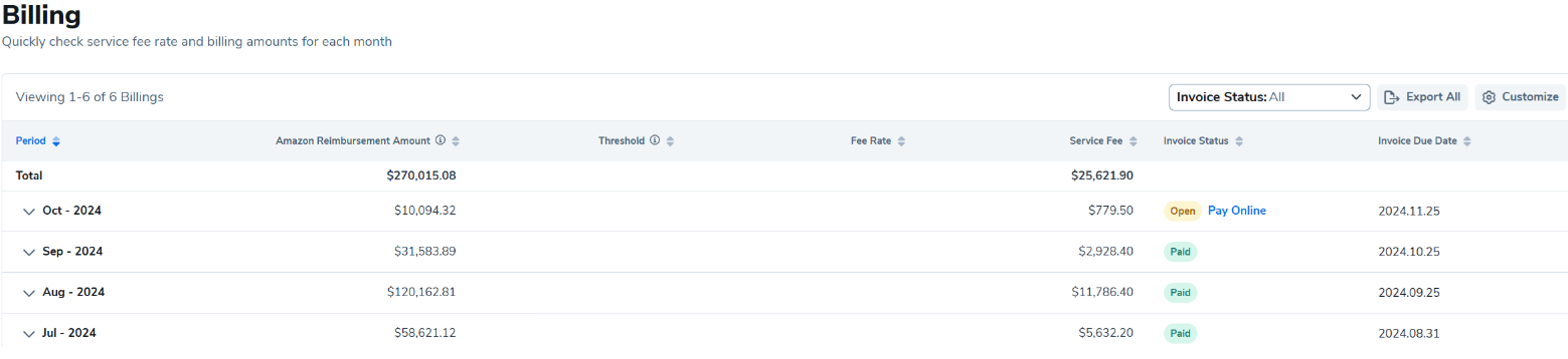 - 阈值 – 这是为每位客户设定的固定美元金额,在每月计算服务费时将从亚马逊赔偿金额中扣除。