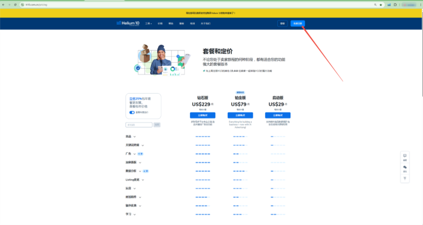 1. 打开官网:Helium10中文官网_免费亚马逊运营工具_listing优化工具