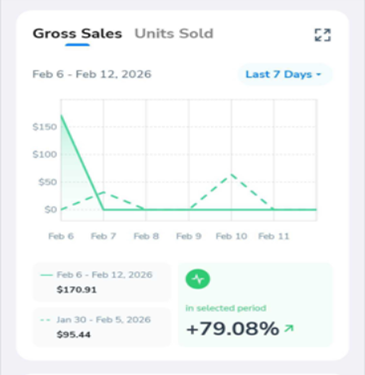 显示所选日期范围内的总收入和产品表现。包括开始和结束日期,以及与上一时期的百分比比较。
