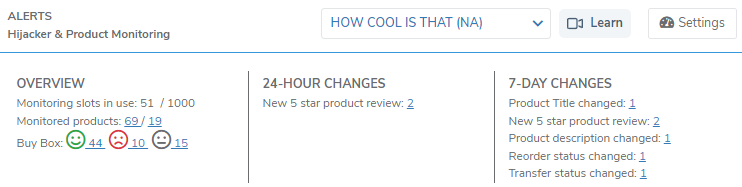 Helium 10在仪表板顶部发布概览,让您查看过去24小时和过去一周影响您监控产品的活动摘要。
