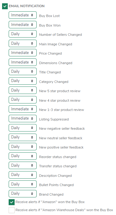 警报工具监控一系列可能影响产品销量的活动。要激活您希望监控的操作,请点击活动旁边的框以选择警报通知的频率。带有勾号的绿色框表示已激活的警报。空框表示未激活的警报。警报不会跟踪未激活项目的更改。