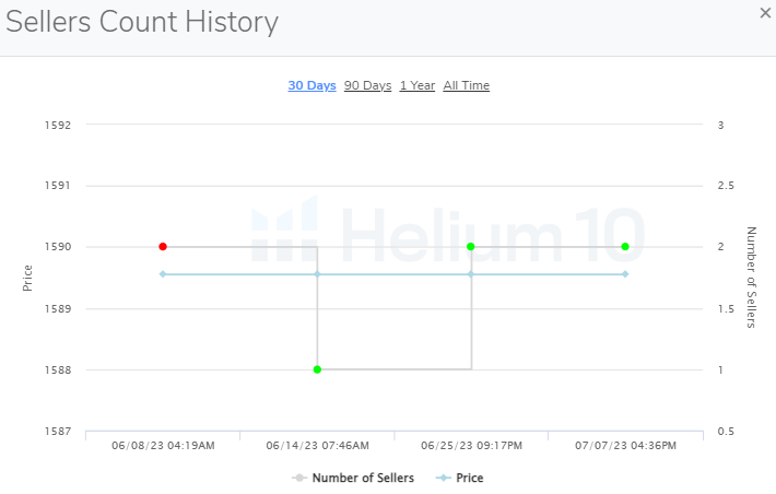最后,如果您想跟踪竞争卖家的数量,警报会发布当前的卖家计数。您可以点击小图表图标打开卖家计数历史记录,查看更具体的详细信息,例如过去30天、90天或365天内的变化,或自产品警报监控激活以来的所有时间变化。