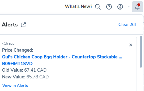 有时,您会在Helium 10主仪表板右上角的黑色铃铛上看到一个红色通知。如果您点击铃铛,它将打开一个警报窗口,显示最近的更改通知。
