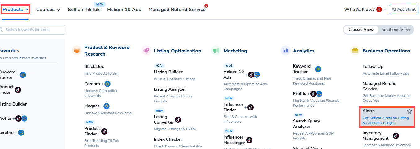 登录您的Helium 10账户,从主仪表板打开产品菜单,点击位于业务运营部分下的警报
