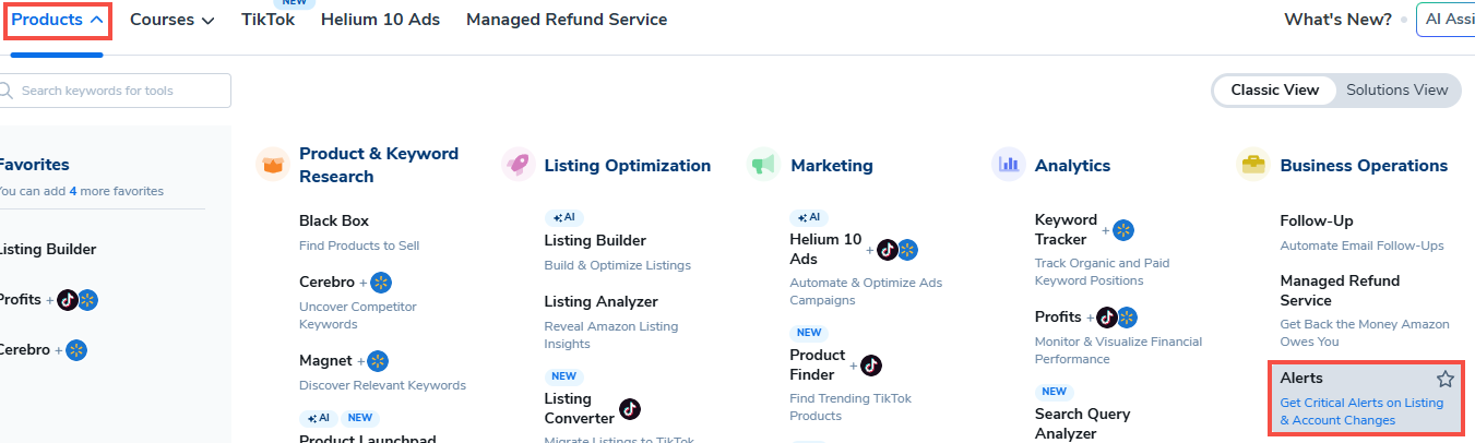 1. 登录您的Helium 10账户,产品监控Alerts位于Products-Classic View下面,如同所示: