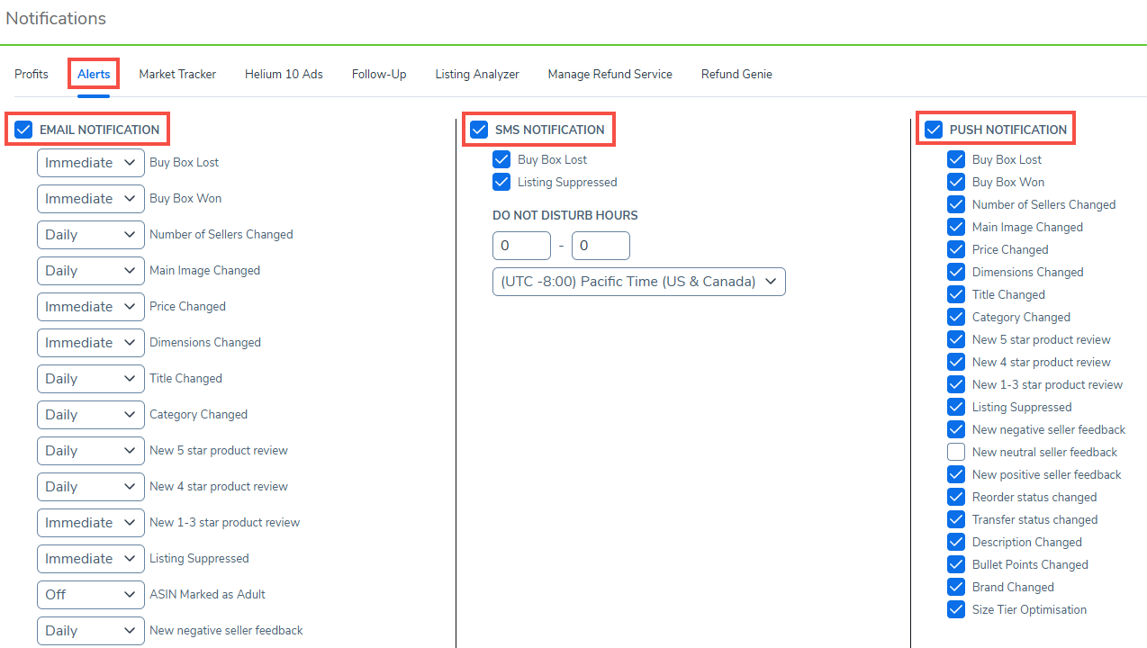 幸运的是,Alerts产品监控在事件发生时立即通知您,帮助保护您的业务。设置和选择您希望接收关于产品和列表的通知事件很容易。Helium 10还允许您通过多种方式接收提醒,包括电子邮件或手机。