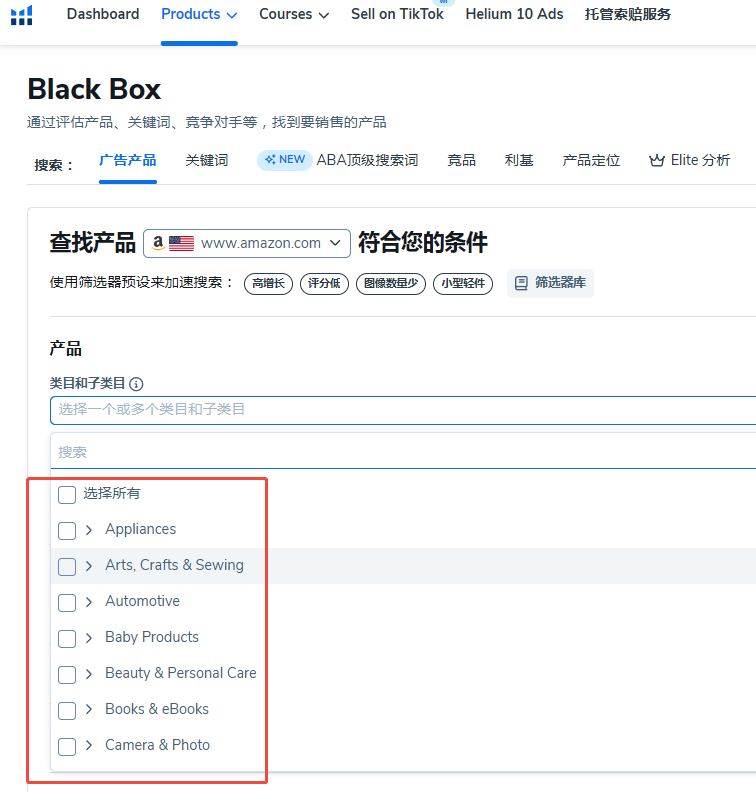 这个列表很广泛,但仍排除了一些类别,如视频游戏、电影与电视、CD与黑胶唱片、Kindle、时尚和音乐。如果您研究的产品不在这些受支持的主要类别中,Helium 10会返回一个N/A占位符。请注意,受支持的市场因国家而异。要检查您销售产品的国家当前是否支持某个类别,您可以在Black Box中查看下拉菜单。