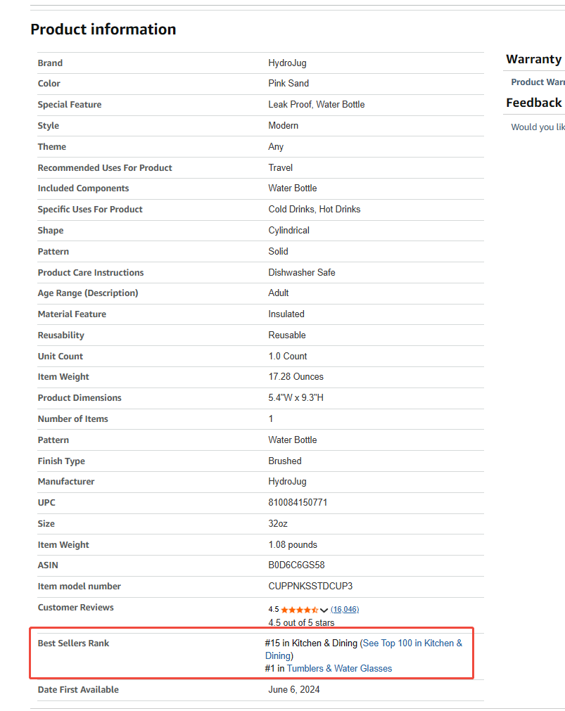 如图,通常在Listing页面,Product information 部分我们可以看到产品大类-Best Seller Rank,。当我们看到See Top 100 in 亚马逊主类目。 这里的主类目即产品大类,说明亚马逊为产品提供了大类目排名,我们也能为之提供预估销量。反之,如果看不到See Top 100 说明亚马逊没有为产品提供大类,我们也无法提供预估销量。因为我们的销量是根据产品大类排名预估的。