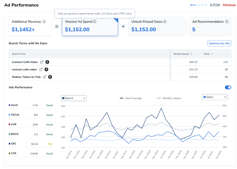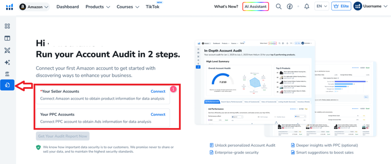审计报告是Helium 10洞察仪表板中的一项功能,旨在为亚马逊卖家提供其账户绩效的高层概览。它能展现优势,突出需要改进的领域,并提供人工智能驱动的建议,以支持更明智的决策。