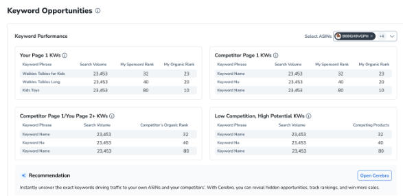 • 将您的ASIN关键词排名与通过黑盒逻辑选出的顶级竞争对手进行比较。