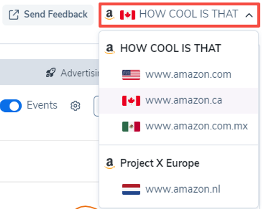 在查看仪表板的数据和洞察之前,请确保您正在研究适合您业务的正确市场。您可以在洞察仪表板右上角的下拉菜单中检查和更改您的市场。