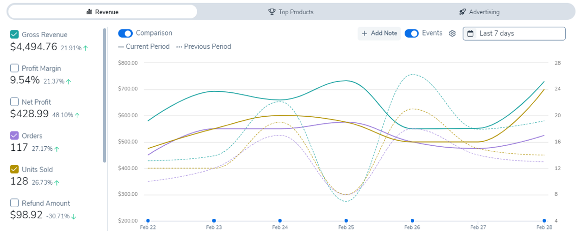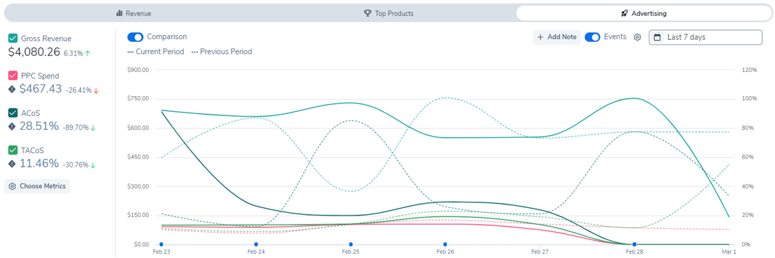 广告选项卡显示您的关键广告指标,包括总收入、PPC支出、ACoS和TACoS。
