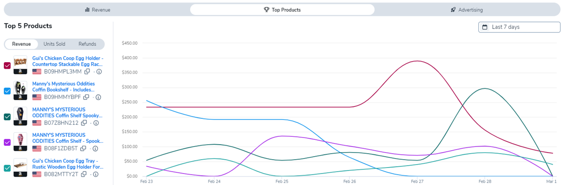 热门产品选项卡显示您热门产品在收入、销售数量或退款方面的数据图表。