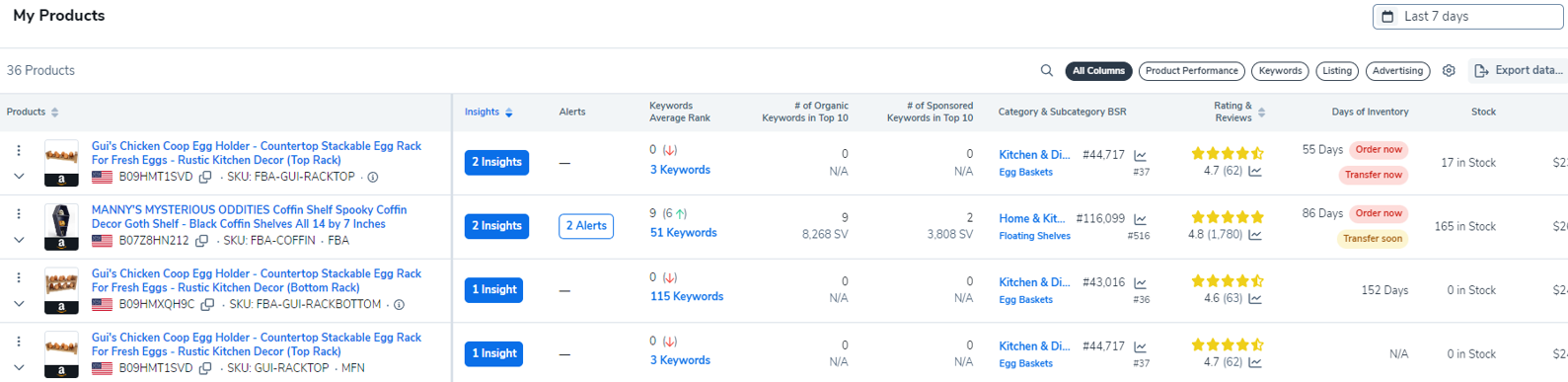 “我的产品”是洞察仪表板的底部部分。它以可定制表格列出您的每个产品,包含有用的指标,包括针对每个ASIN的特定洞察和警报。