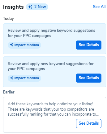 洞察仪表板中列出的第一部分是“发展您的业务”部分。此部分提供针对您列表定制的快速、可操作的建议,旨在帮助您发展业务。对于每个建议,您将看到潜在影响级别以及一个查看详情按钮。点击查看详情将打开一个弹出窗口,其中包含有关建议的更多详细信息以及实施建议的方法。选择查看全部将打开洞察工具,其中包含您列表的所有建议,以可筛选列表形式呈现。