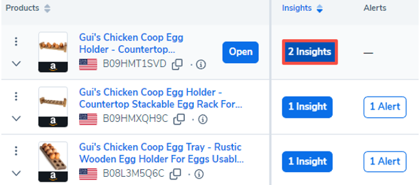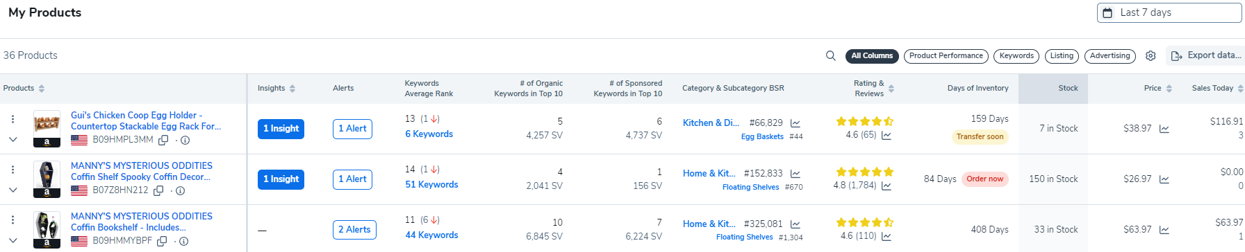 “我的产品”位于您的洞察仪表板底部区域。它以可自定义的表格列出您的产品,包含有用的指标,包括针对每个ASIN的特定洞察和警报。您初始拥有的ASIN数量取决于您的套餐:
