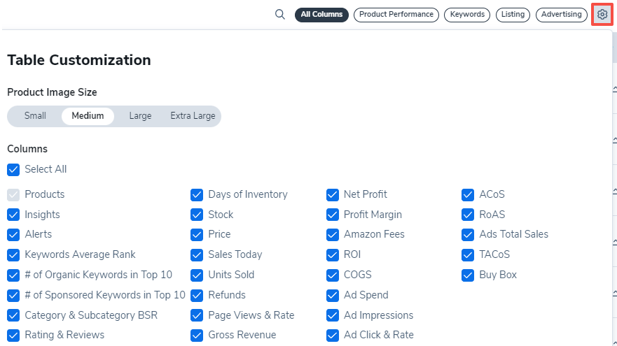 您的“我的产品”部分可以显示大量产品数据和指标。要调整表格中显示的指标,请点击齿轮图标以选择/取消选择每一列。此菜单还允许您调整产品图片大小。