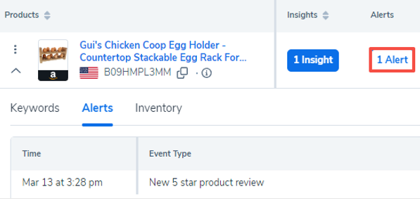 如果您展开一行,您将看到关键词、警报和库存的标签页。这将为您提供该ASIN的数据快照。