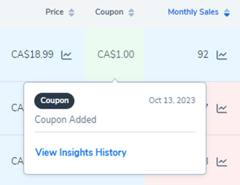 将鼠标悬停在竞争对手表格中的指标上通常会显示额外数据。如果您选择查看洞察历史,表格将展开以显示该产品的洞察历史。您可以筛选事件类型以显示您感兴趣的指标。表格将显示事件类型、旧值和新值。