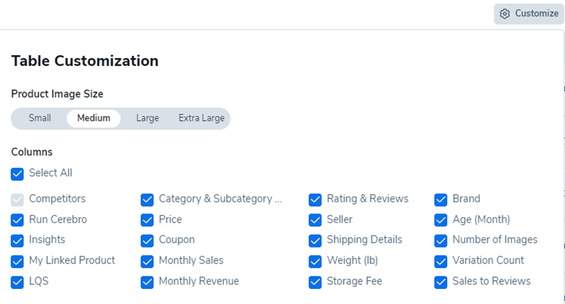 。从此菜单中,您可以选择偏好的产品图像大小,并选择/取消选择要显示的列。