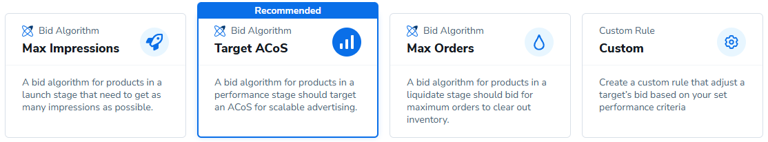 • 目标ACoS:适用于处于表现阶段、应针对可扩展广告设定ACoS目标的产品的出价算法。 这是默认推荐的出价算法。