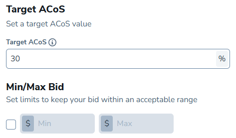 7. Helium 10 广告 将设置默认的目标ACoS为30%。您可以更改此target to a different amount that is better suited for your advertising goals. Consider adding a Min/Max Bid by checking the box and entering your preferred amounts for min and max bids.