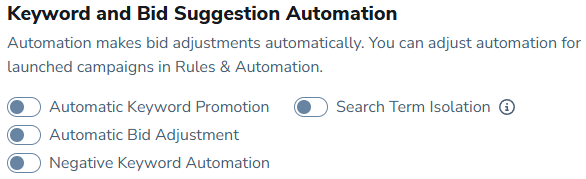 在窗口底部,请注意自动关键词推广(根据上述顺序)、出价调整和否定关键词默认关闭。如果您希望关键词和出价建议自动化,可以通过切换每个操作的开关来启用。请注意,建议您查看建议页面,以了解这些规则将生成的推荐内容,直到您确信可以将其自动化为止。